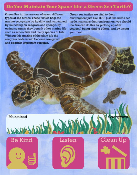 This is a Poster of Sea turtles whose purpose is to hang in a classroom to learn how to maintain your space.