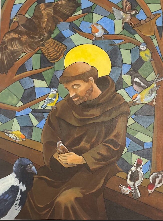 This is an acrylic painted piece that depicts St. Francis with Italian birds.