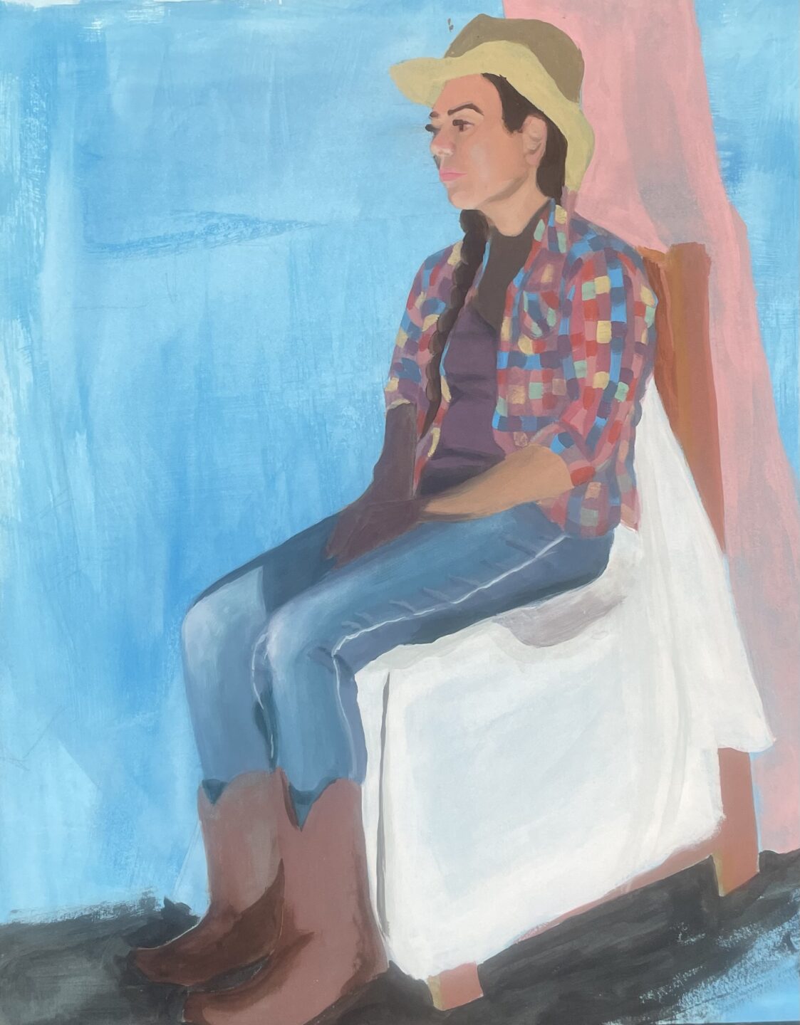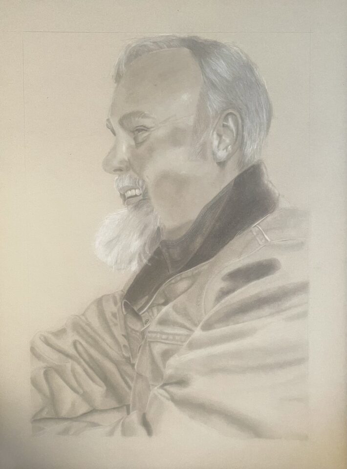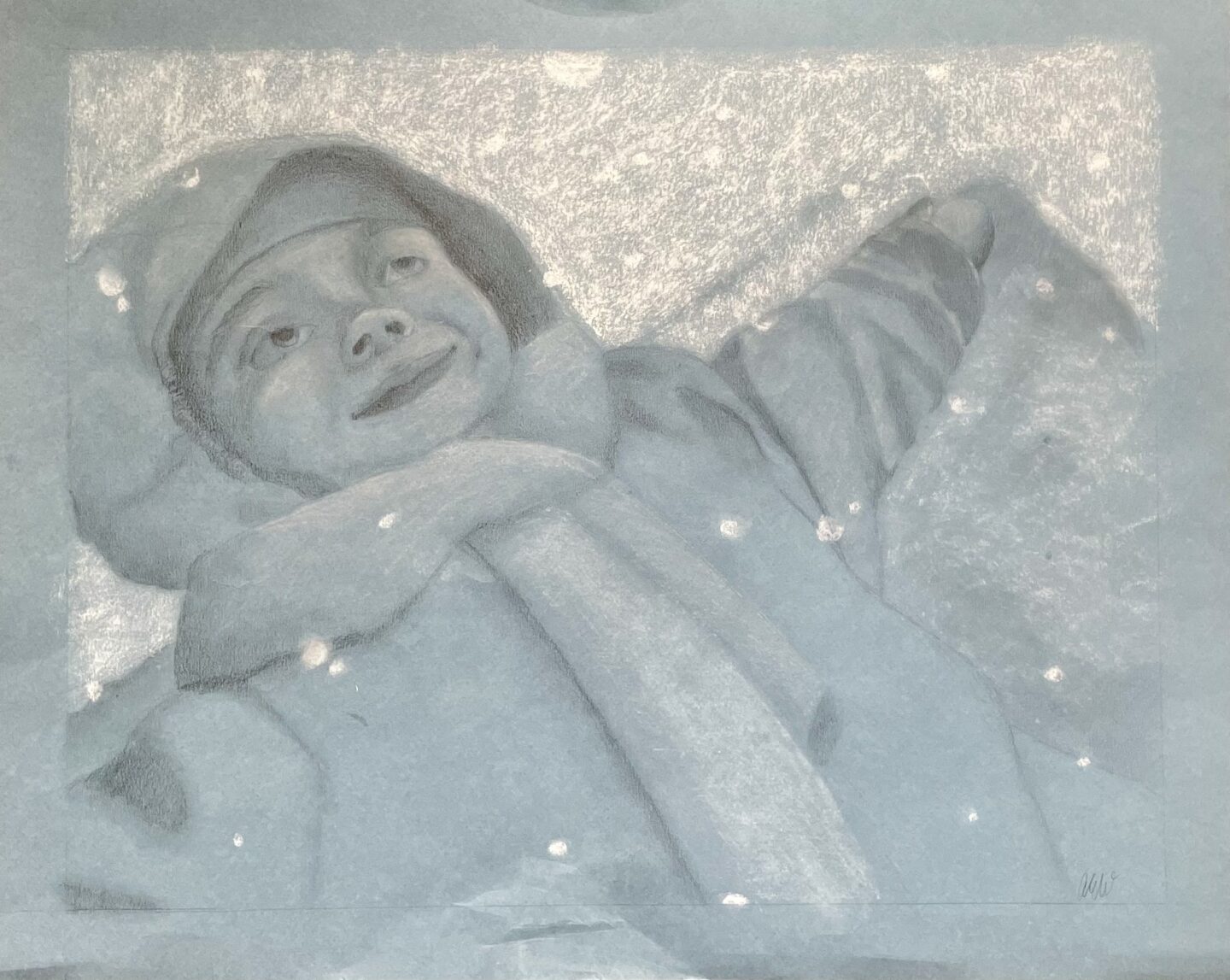 This piece is depicting the feeling of wonder and was created with white charcoal and graphite on blue paper.