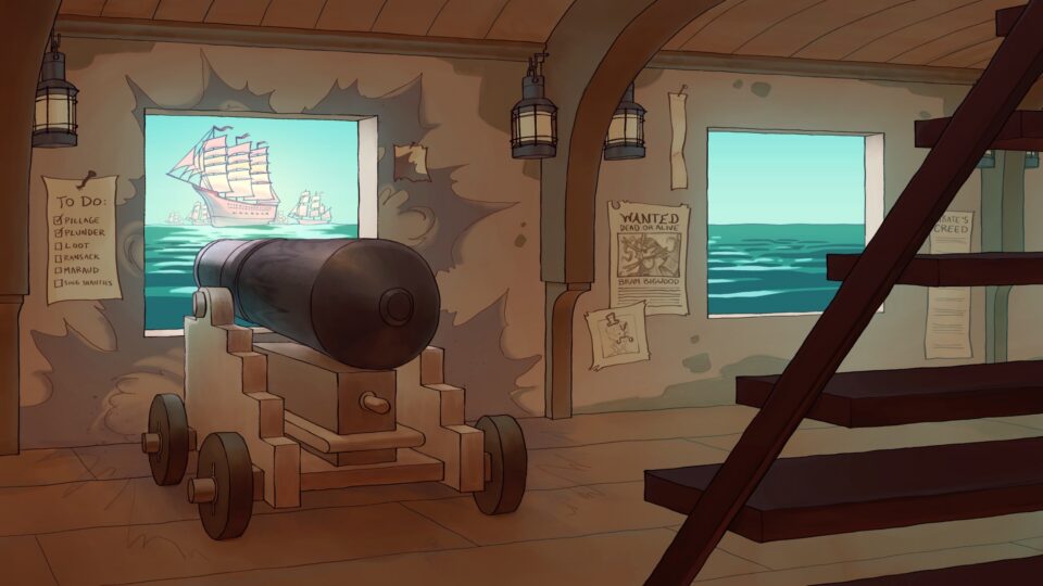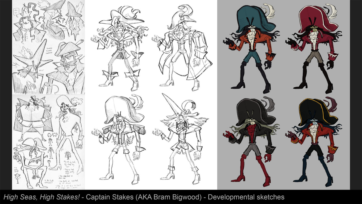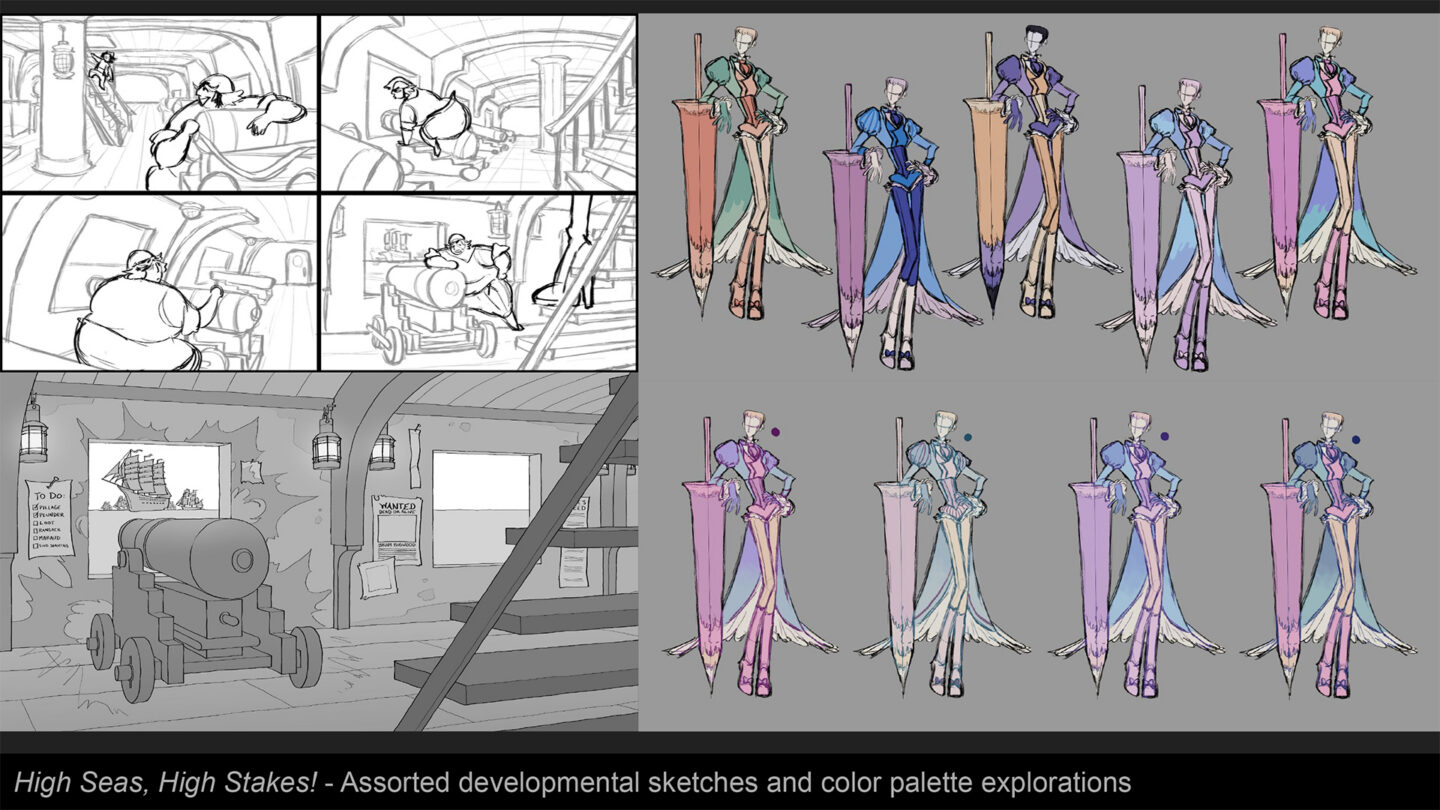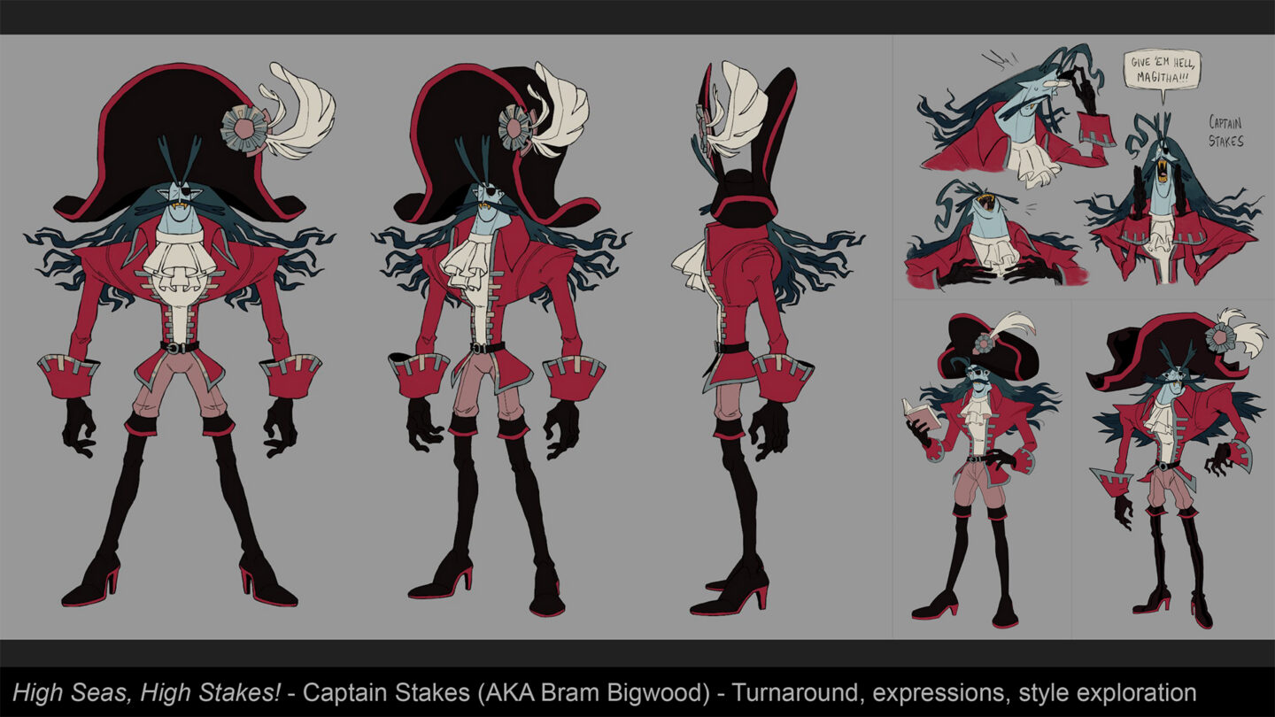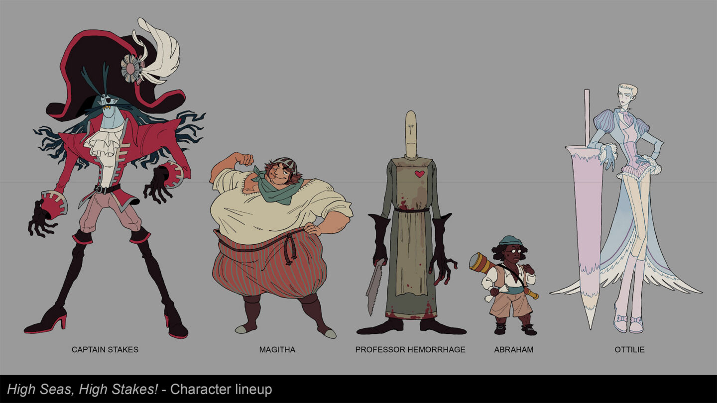 Visual development for a potential series of 2D animated shorts called "High Seas, High Stakes!" On the run from a group of vampire hunters that work for various European governments, a boisterous vampire turns to a life of piracy and sets sail on the Seven Seas.