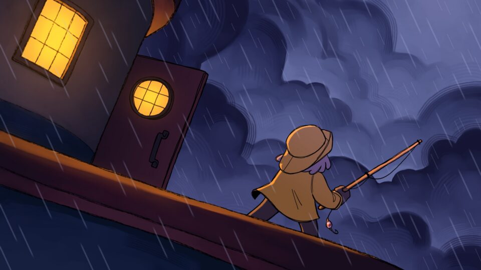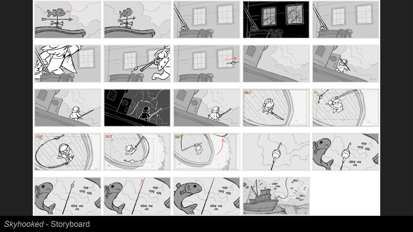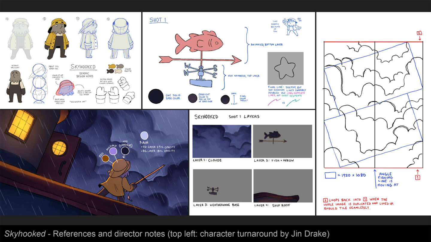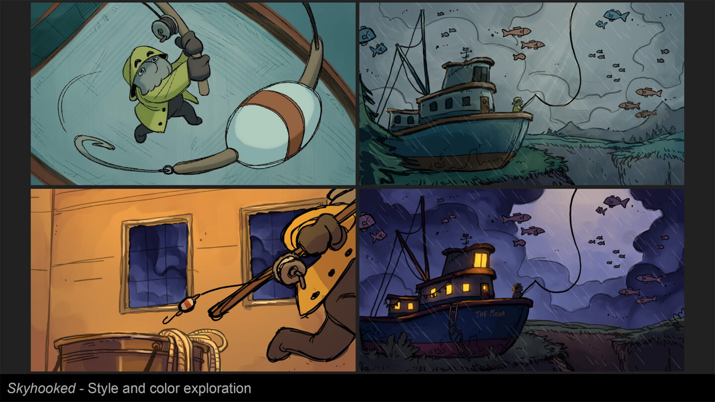 "Skyhooked" is a 2D animated short about a lone fisherman who rushes to go fishing in the sky during a thunderstorm. I created the original concept for "Skyhooked" and acted as director for the project, but the final product was the result of a collaborative effort with fellow CCS animation students Bea Nasarzewski, Emma Boyl, Sabina Montalva, and Jin Drake. The material showcased here is only my fraction of the project.