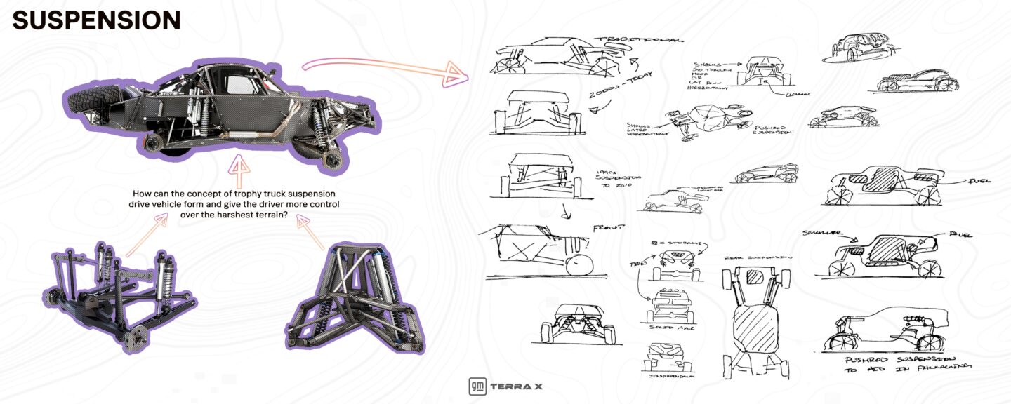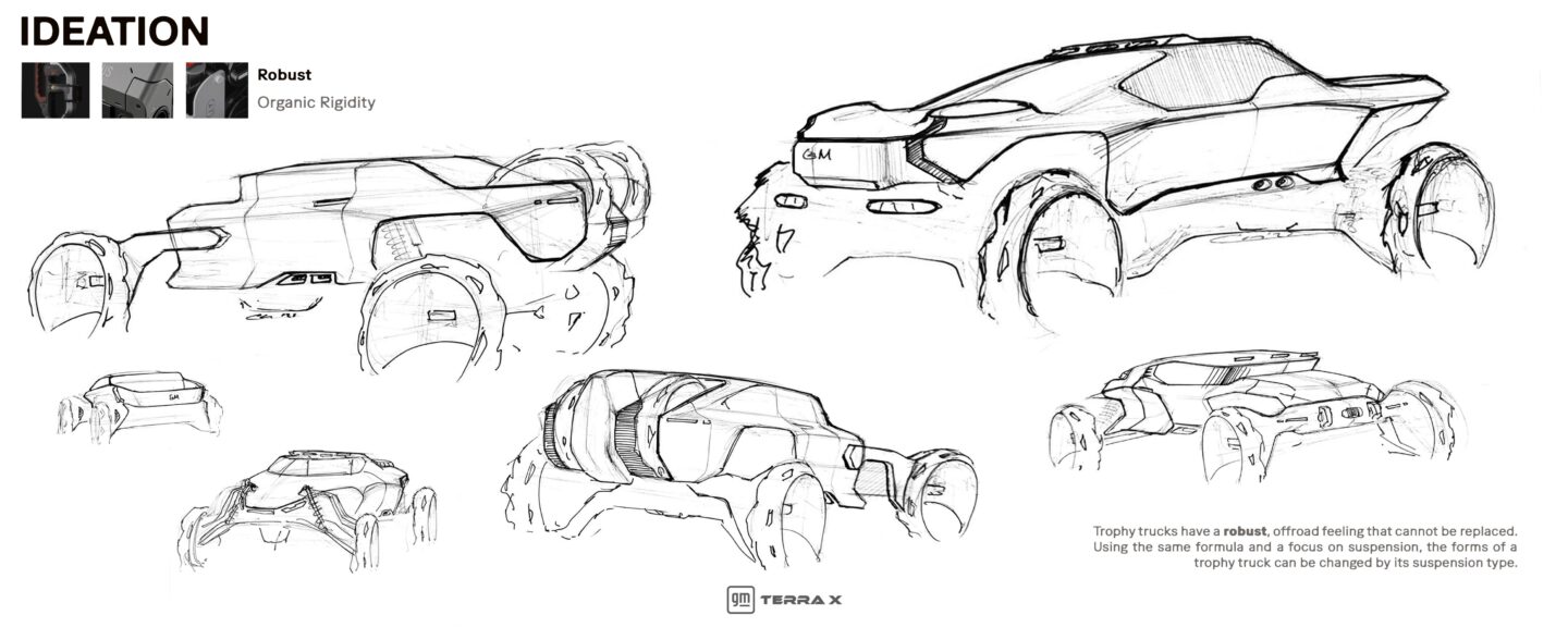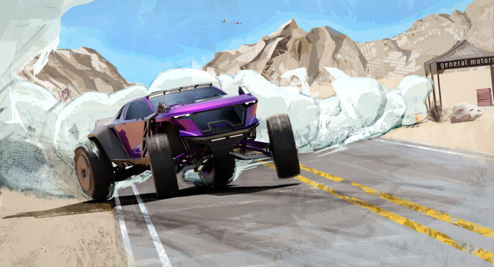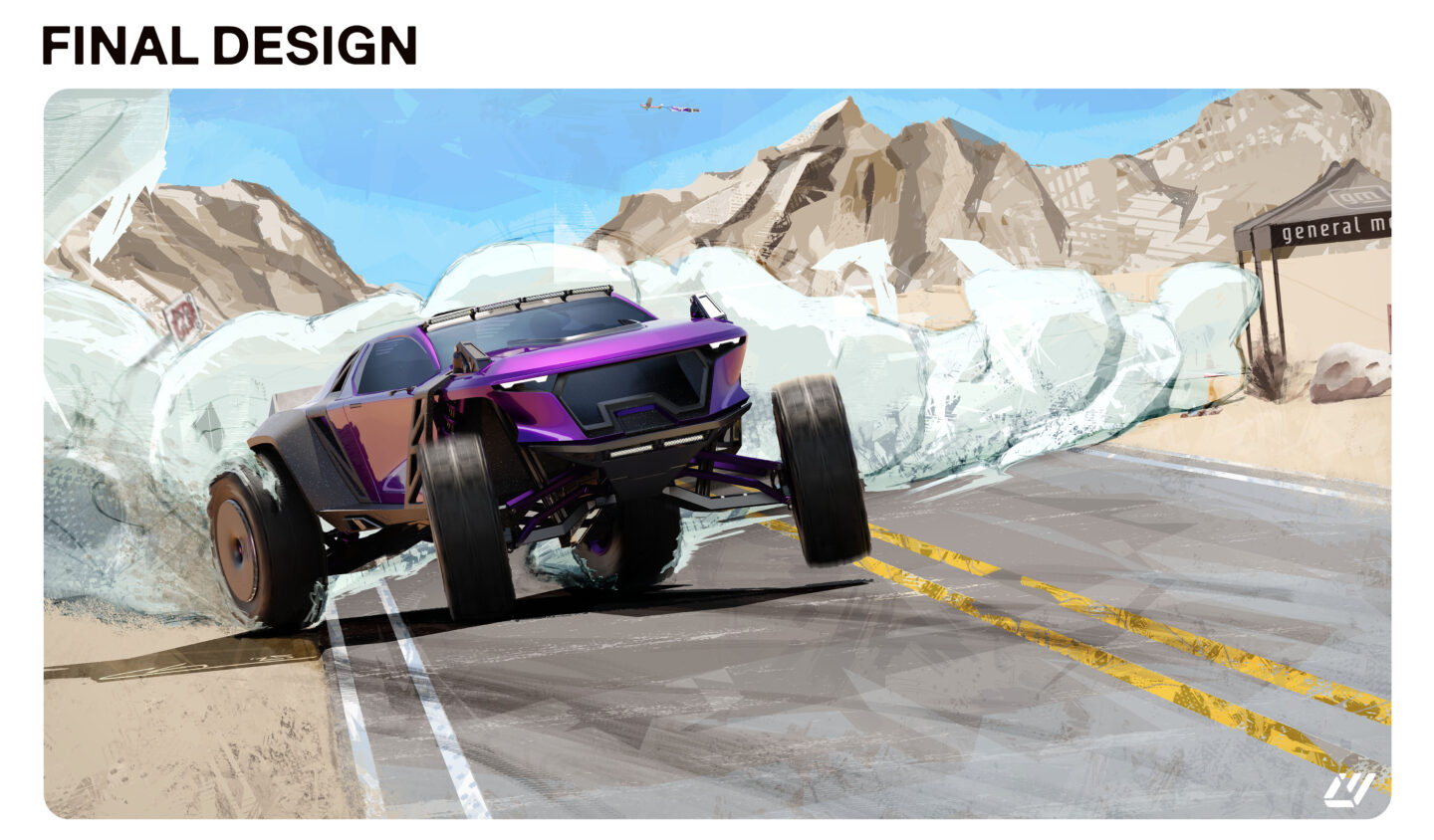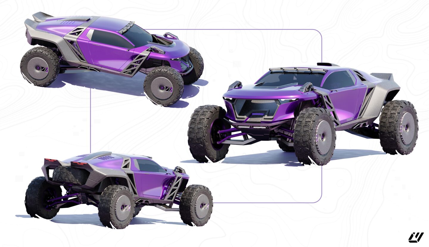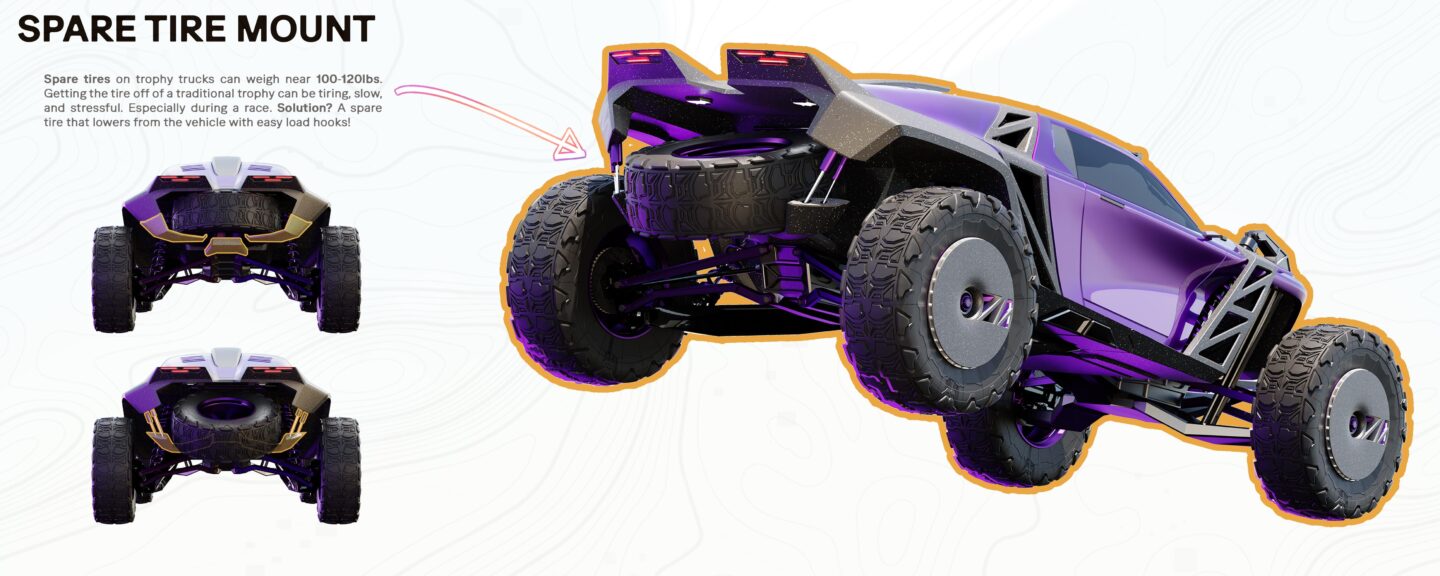 Offroad racing vehicle for the Baja 1000 in 2050. Where dirt roads and offroad racing is significantly more aggressive than before. A cross between a muscle car and trophy truck with a focus on pushing suspension technology into the future while guiding form.