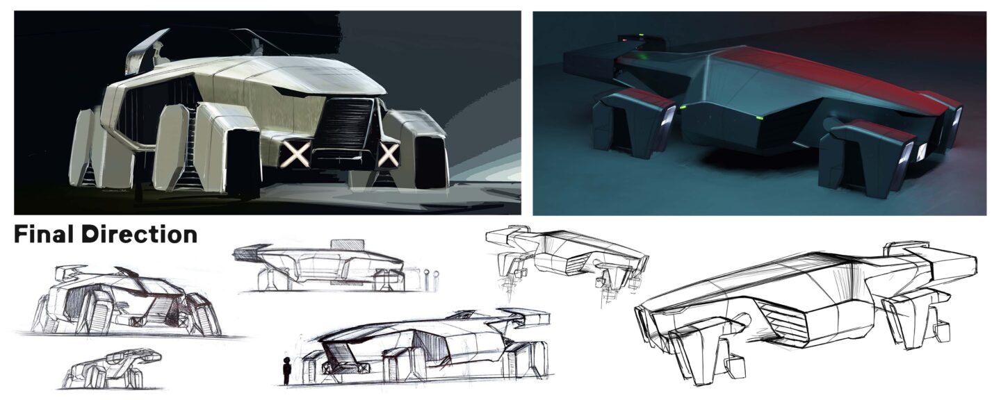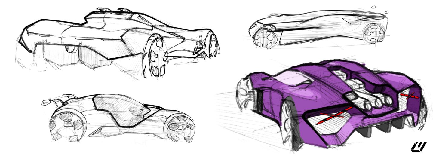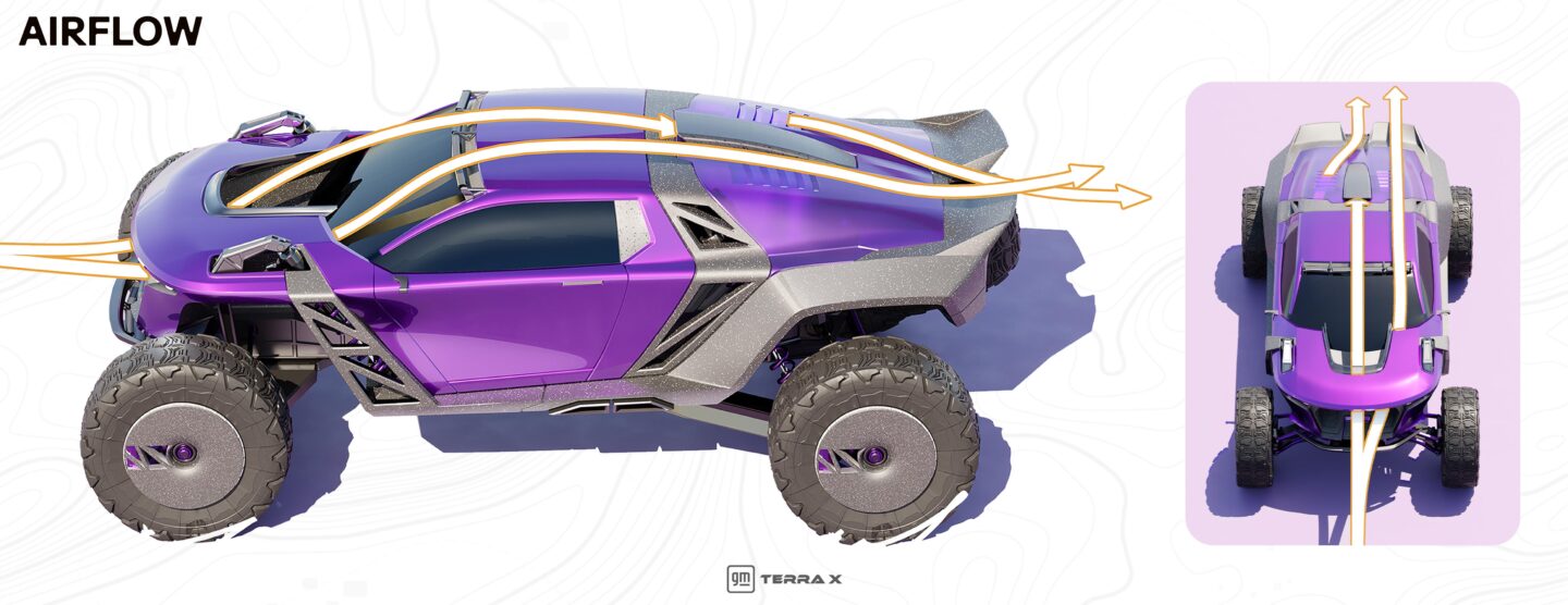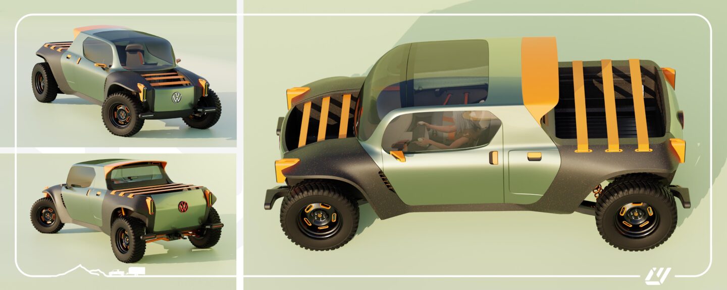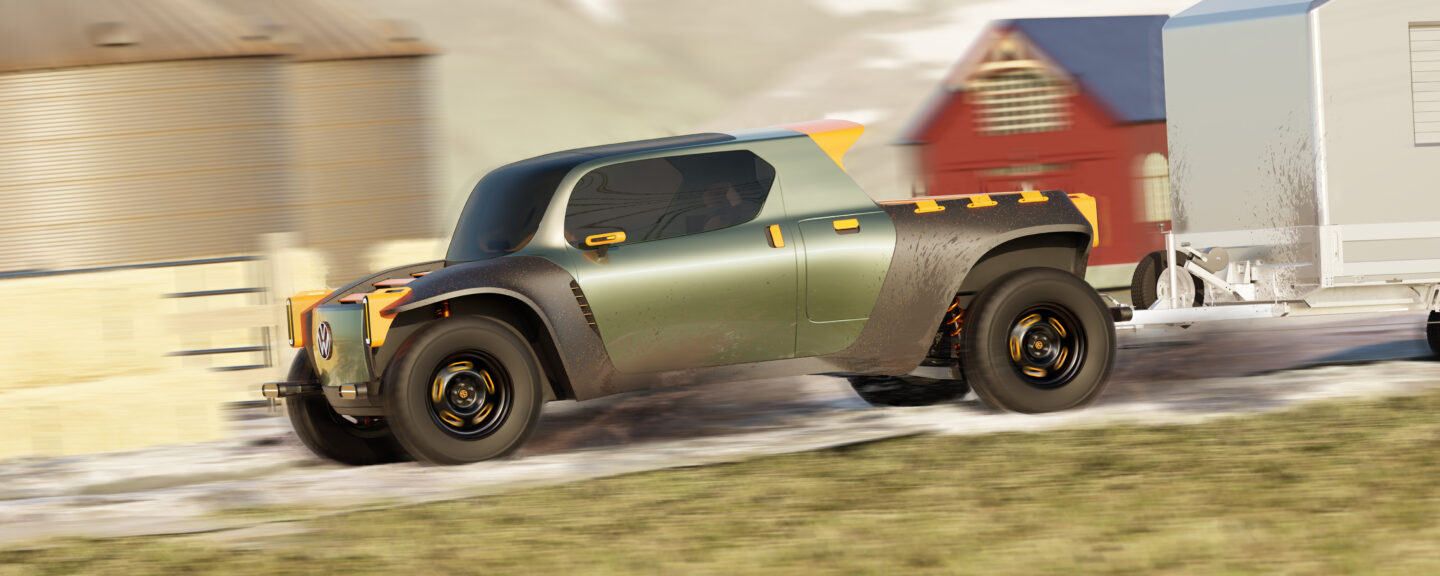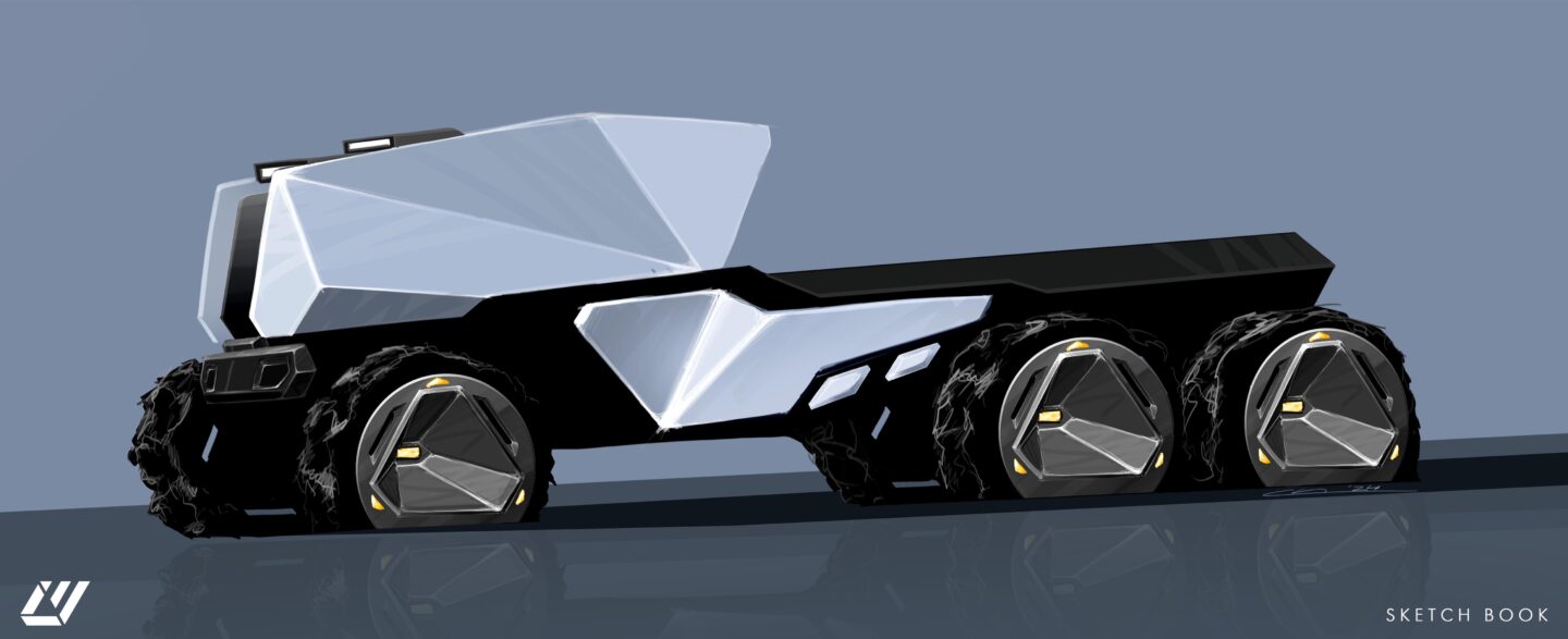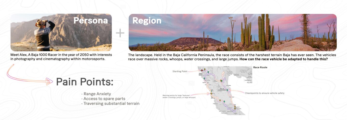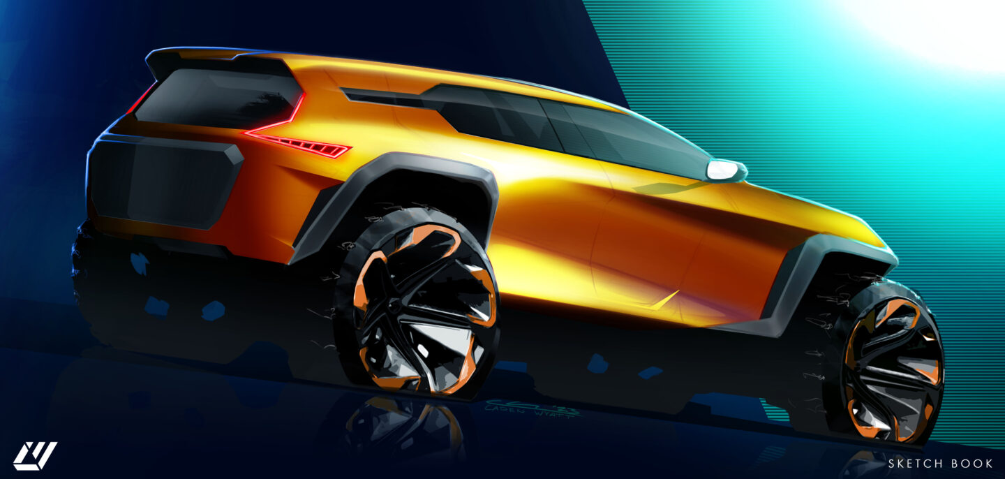 Offroad racing vehicle for the Baja 1000 in 2050. Where dirt roads and offroad racing is significantly more aggressive than before. A cross between a muscle car and trophy truck with a focus on pushing suspension technology into the future while guiding form.