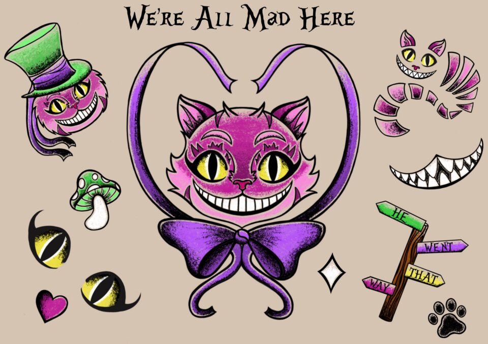 Cheshire Cat tattoo flash sheet
