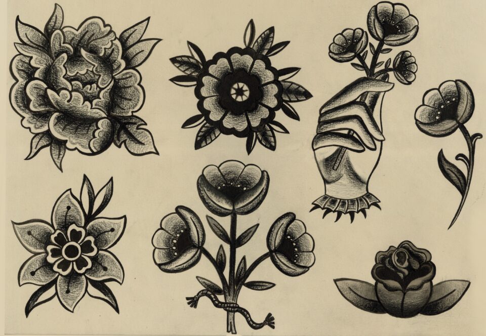 American traditional flower tattoo flash sheet