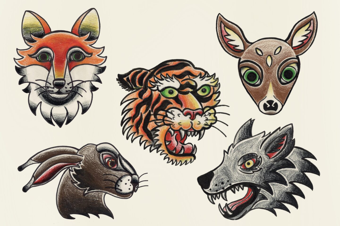 Predator and prey animals in the American traditional art style