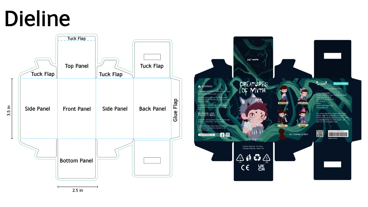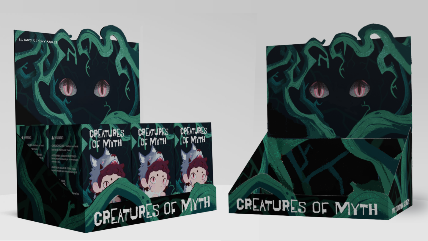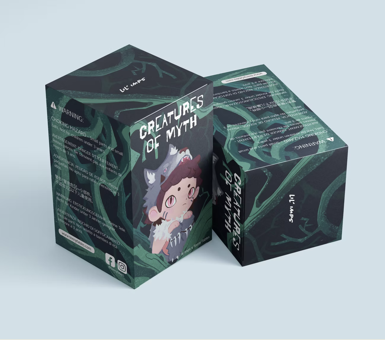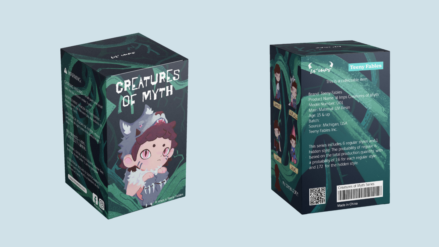 Teeny Fable’s Lil Imps are shape-shifting sprites inspired by English folklore. Though usually harmless, they delight in mischief, and an encounter with one always leaves you guessing. Will they be a friend or trickster? The debut series, Lil Imps: Creatures of Myth, introduces these characters reimagined as mythical beings drawn from cultures around the world. --- In an ongoing collaboration with peers, we set out to create a collectible art toy concept. As the designer, I worked on development of the characters, the art direction of the blind box, and the assets/design. This project includes Individual + Display Packaging, and Character Lineup.