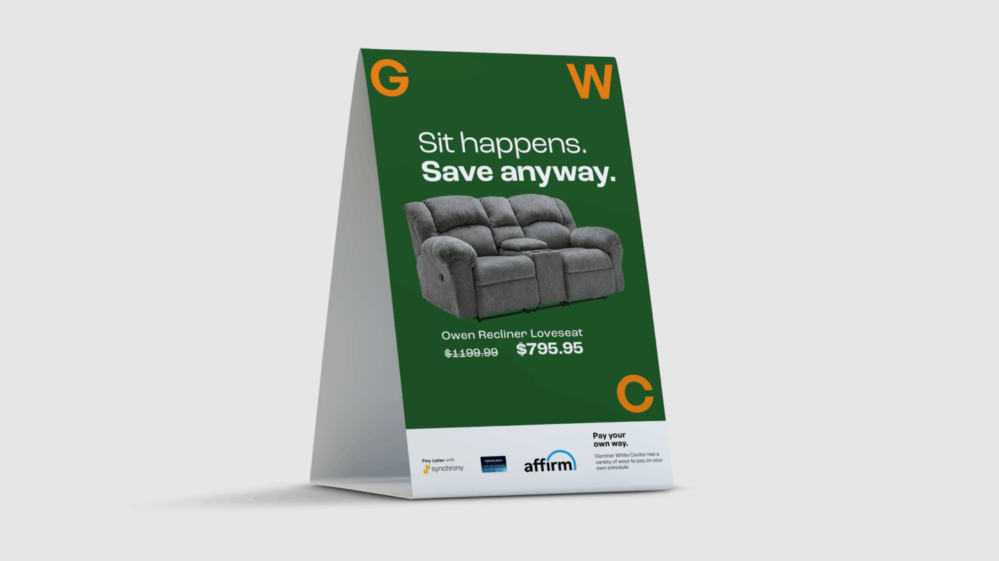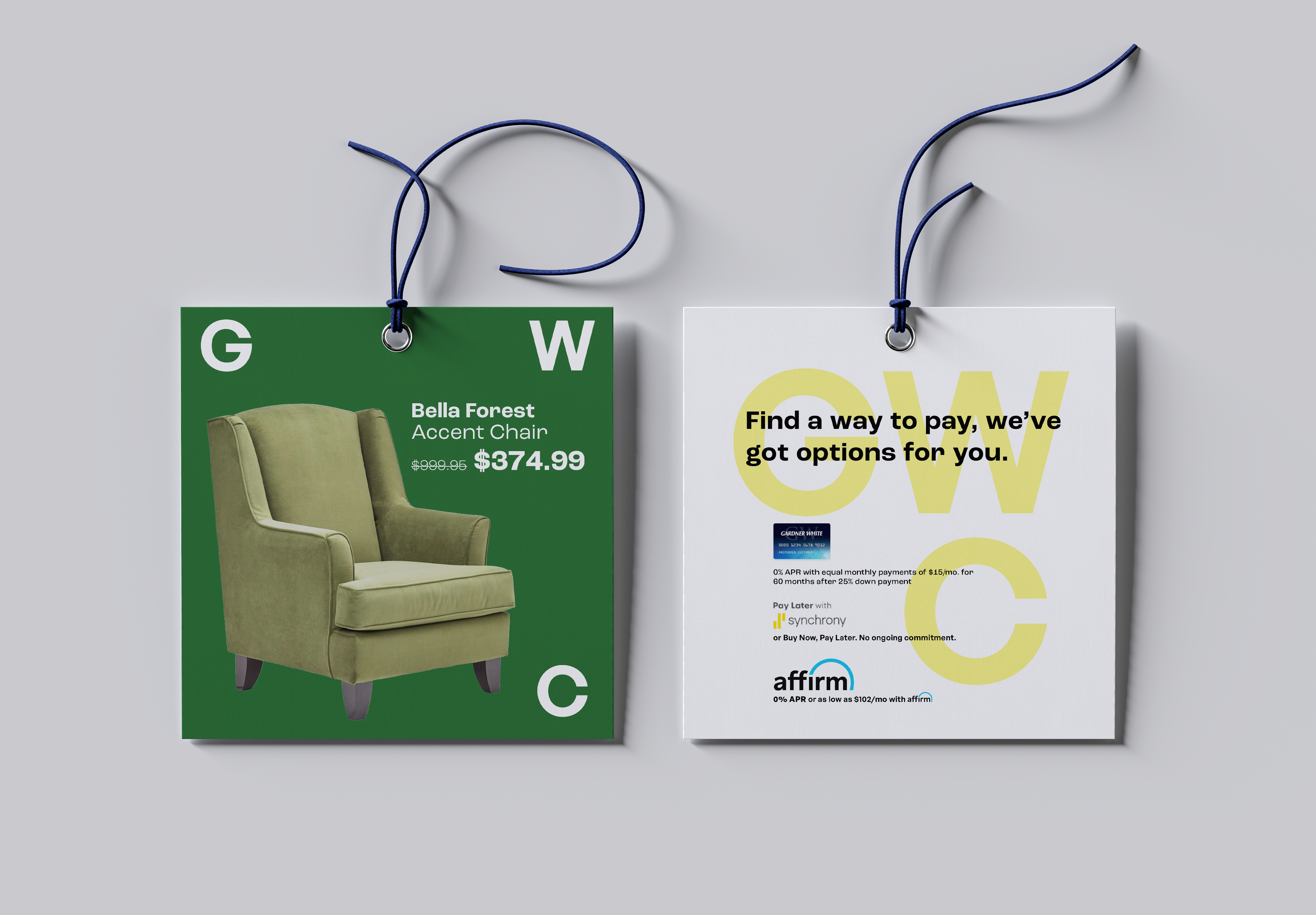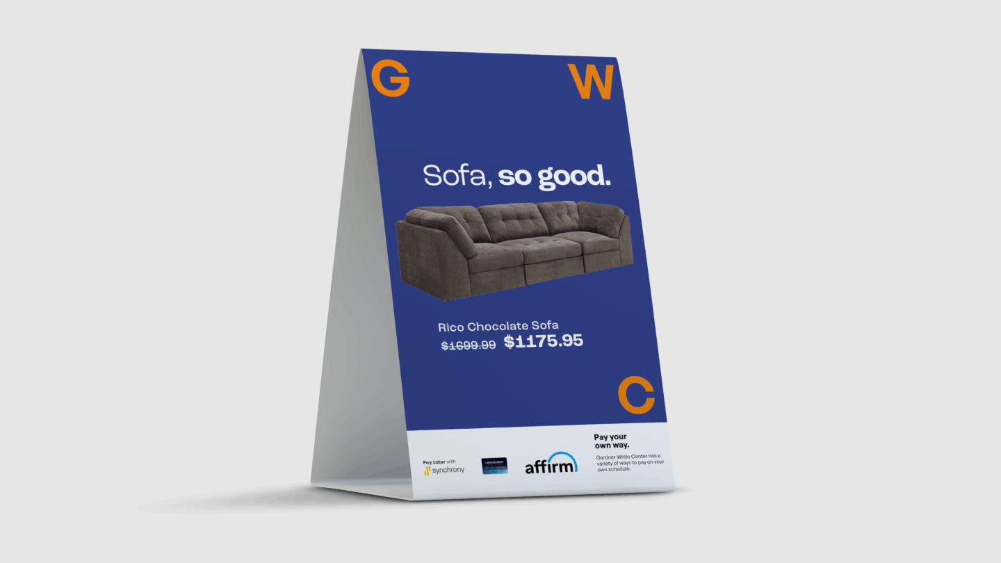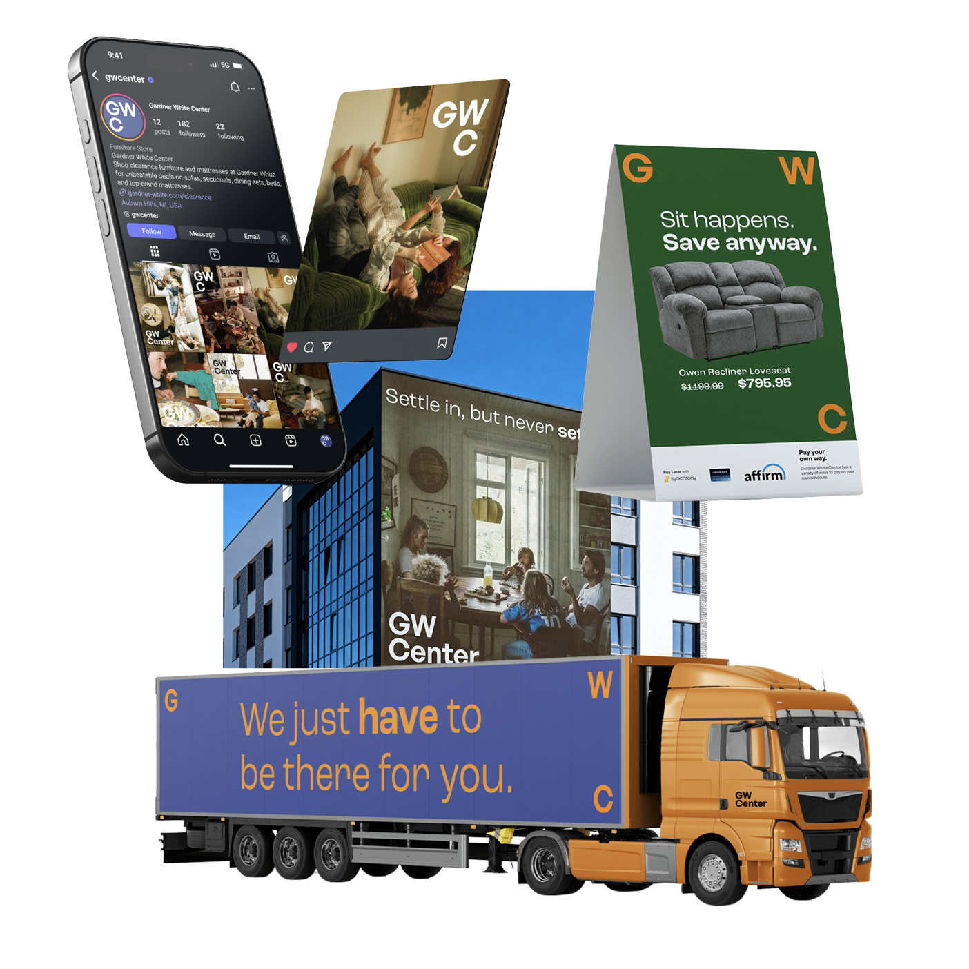 Gardner White's (GW) Clearance Center needed a rebranding. In this sponsored studio, we worked directly with marketing contacts from GW, using their demographic research to fuel research and their feedback to guide iteration. With teammates Quang Dao, Reese Mallon and Niclas Mueller, we created brand language and visuals to offer in a final presentation. Our work was reviewed by the same marketing team as well as CEO Rachel Stewart.
