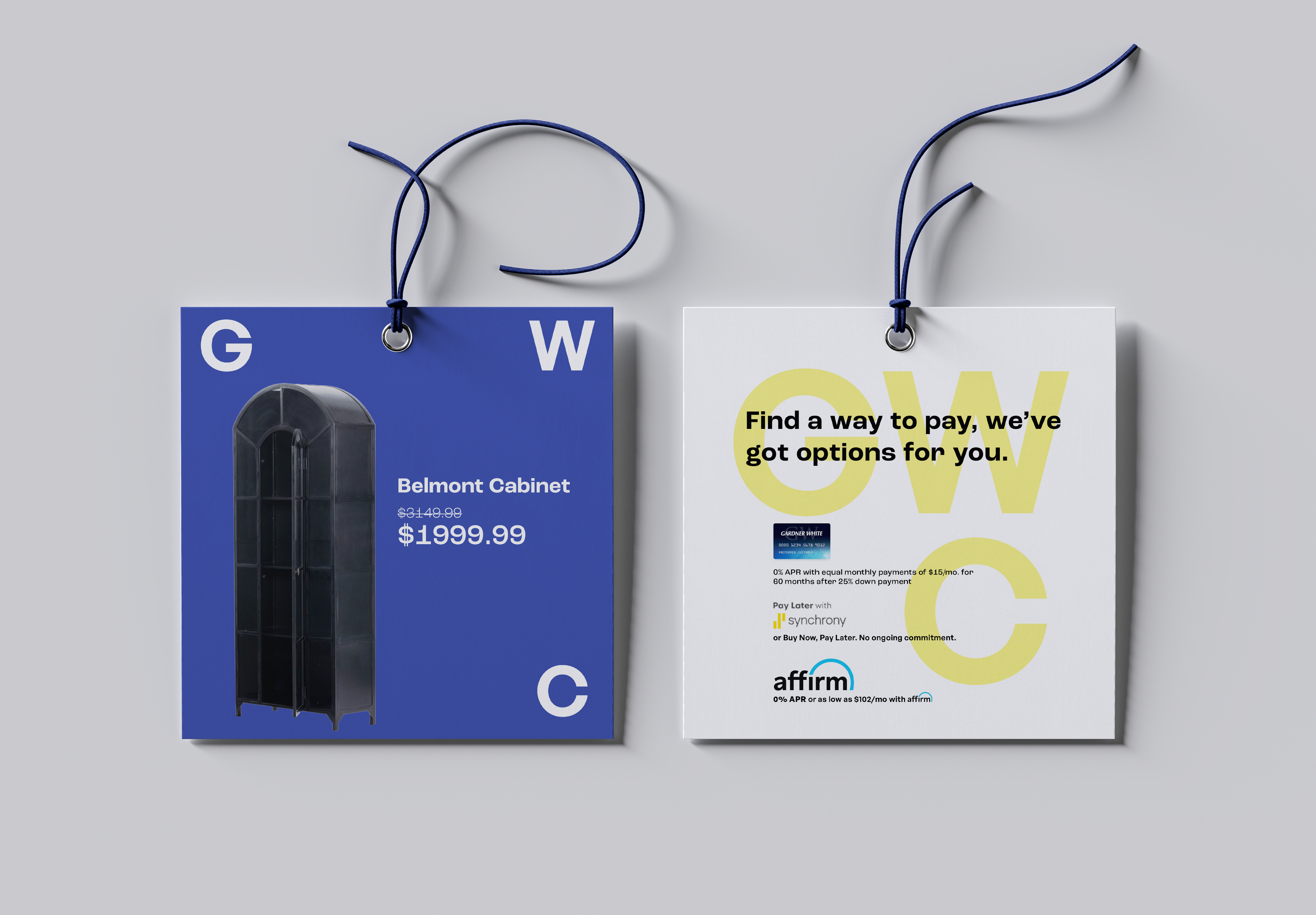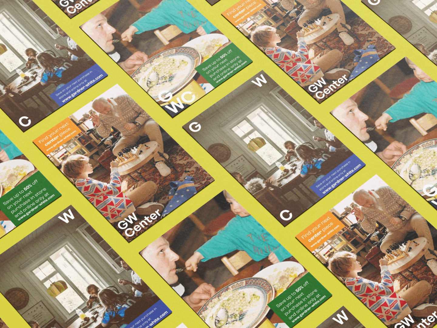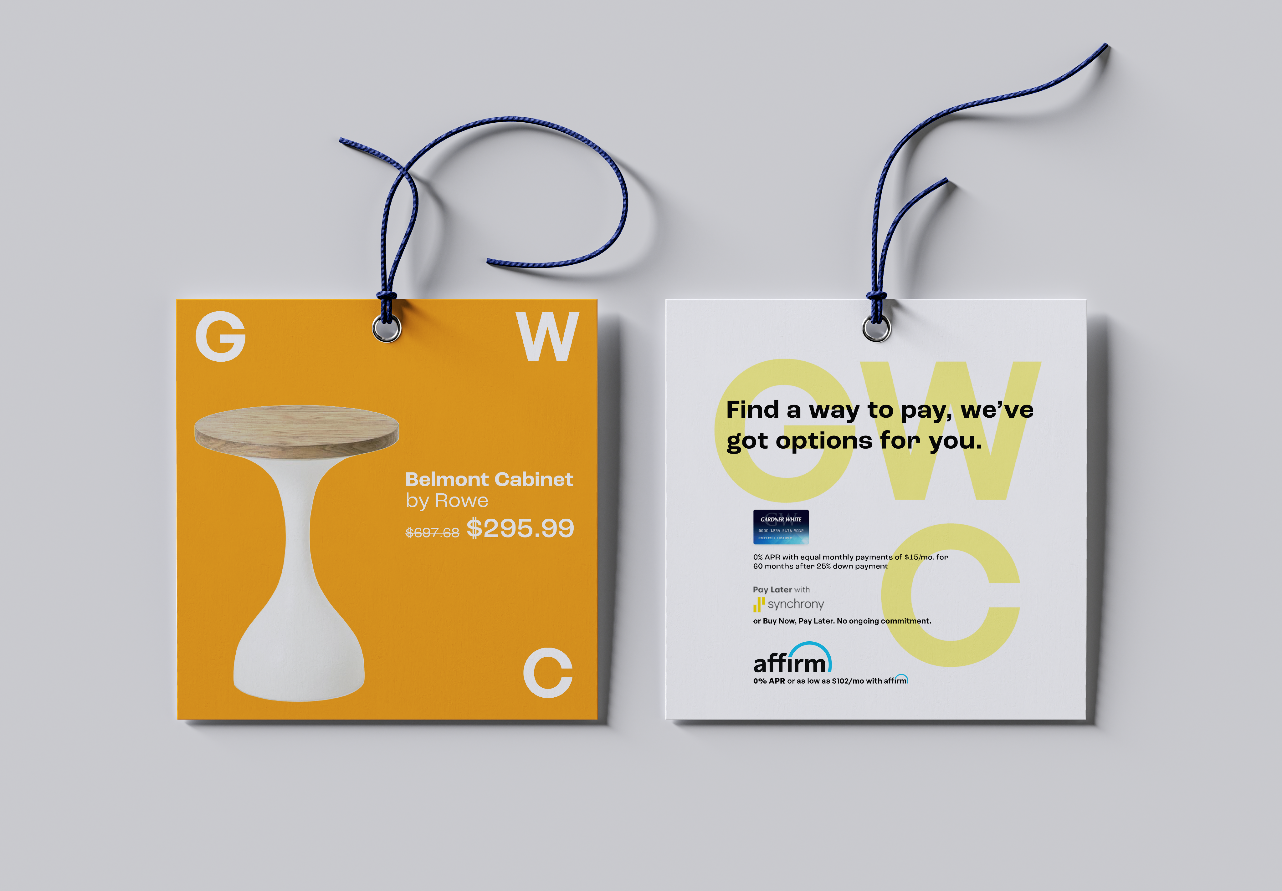 Gardner White's (GW) Clearance Center needed a rebranding. In this sponsored studio, we worked directly with marketing contacts from GW, using their demographic research to fuel research and their feedback to guide iteration. With teammates Quang Dao, Reese Mallon and Niclas Mueller, we created brand language and visuals to offer in a final presentation. Our work was reviewed by the same marketing team as well as CEO Rachel Stewart.
