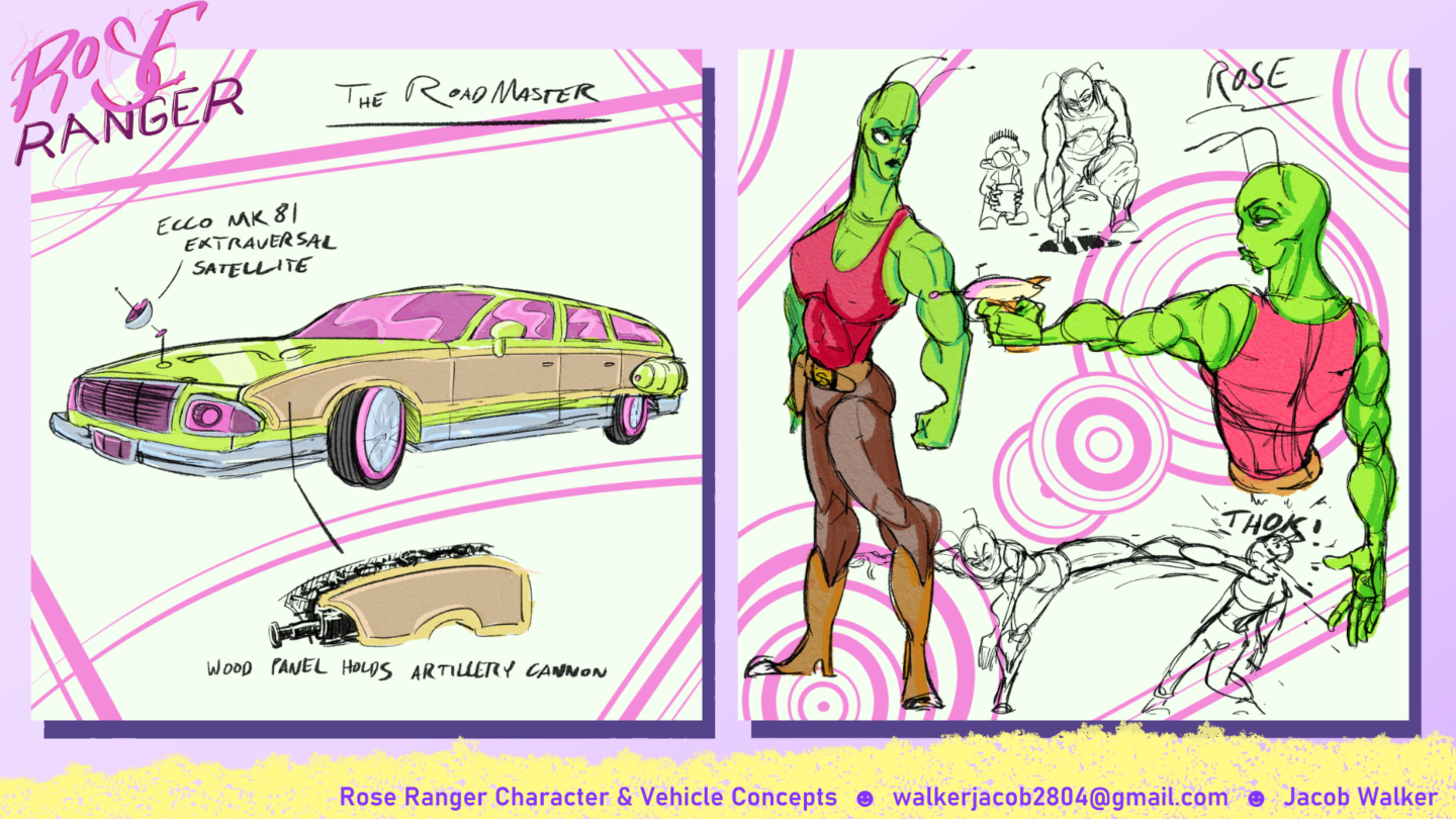 Rose is a former military assassin turned intergalactic bounty hunter surviving through one simple rule: stay out of the way. Io is a kid with a genius mind, and while acting as Rose's resident mechanic, gadgeteer, and weapons expert, he also dreams of using his genius to stop corruption in the galaxy as the costumed vigilante, Bug Boy. Rose Ranger was a Visual Development project made for the purpose of expressing an overall ability to conceptualize characters and environments in a cohesive world.