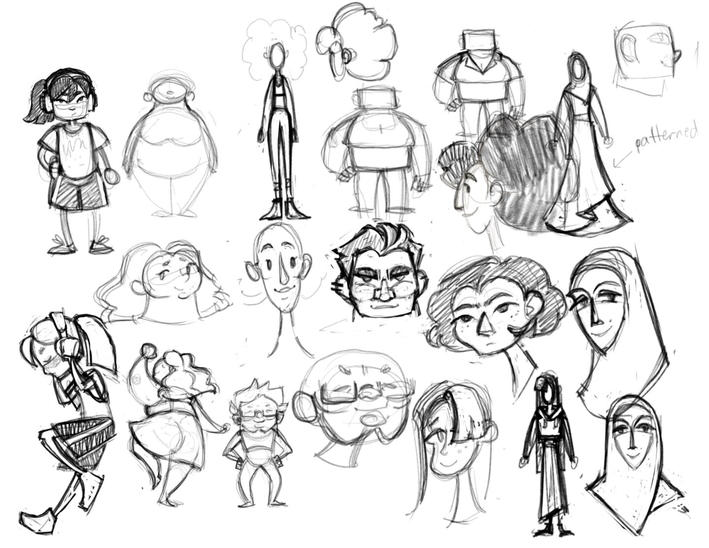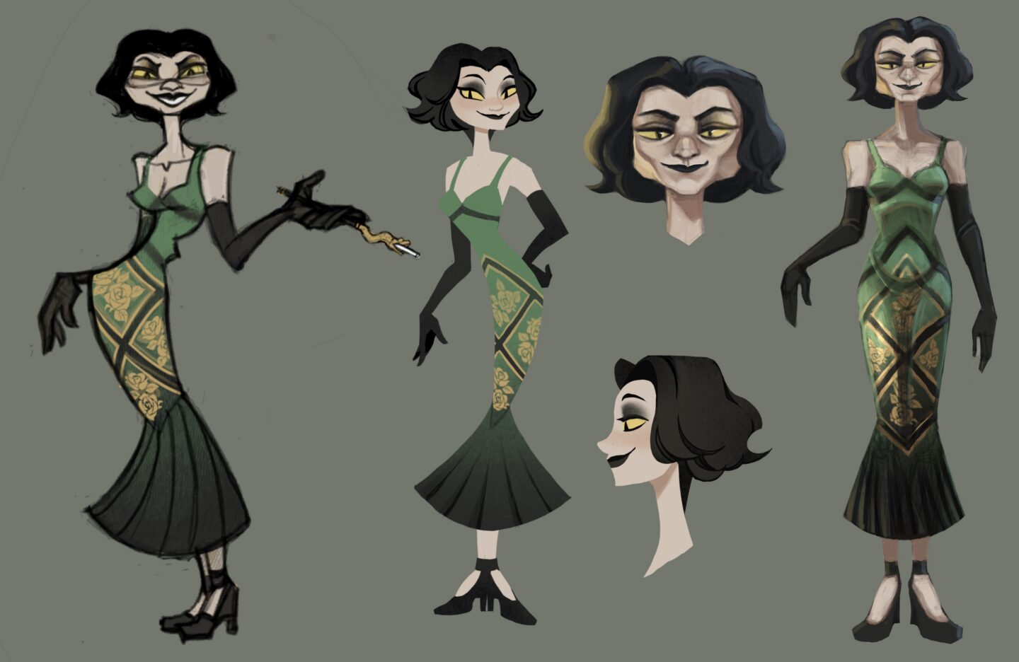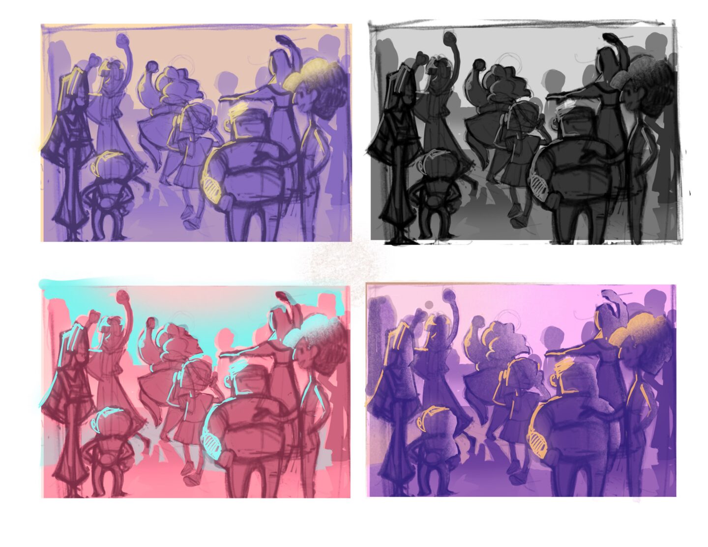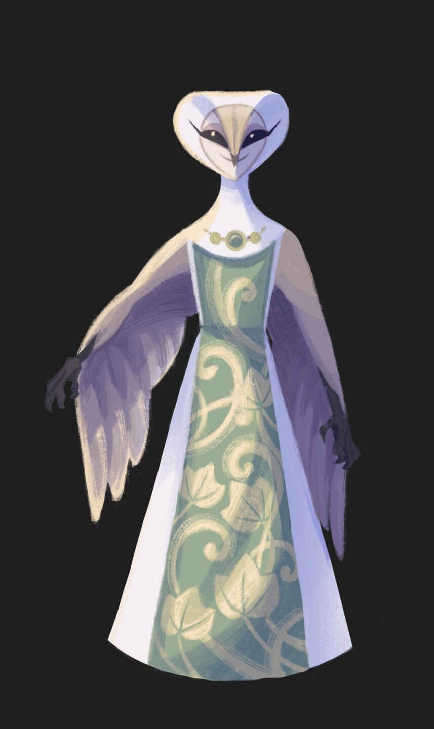 An original character design followed by style studies of (from left to right) Disney artist Brittney Lee and the Netflix series Arcane. The goal here was to convincingly recreate the differing styles while maintaining some of the original character's shape design.