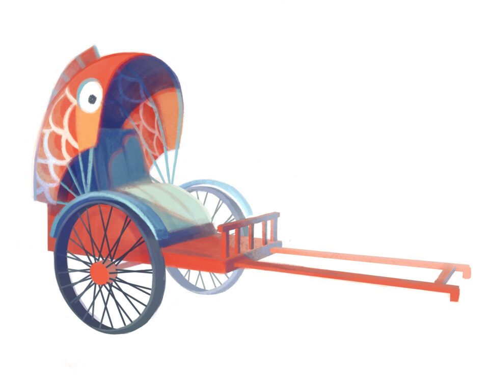 A design for a rickshaw-type vehicle with a koi pattern.