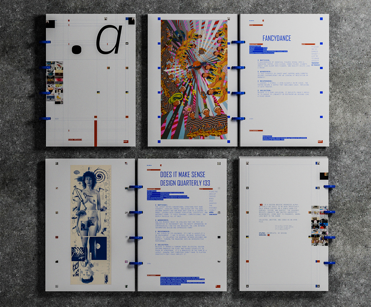 A system driven archive of seventy design works organized through a strict spread structure and consistent metadata. Each piece is paired with reflective writing, and the entire book is held together by a grid, custom styles, and a binding method that reinforces the engineered feel of the project.