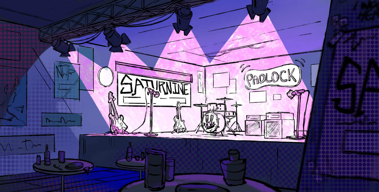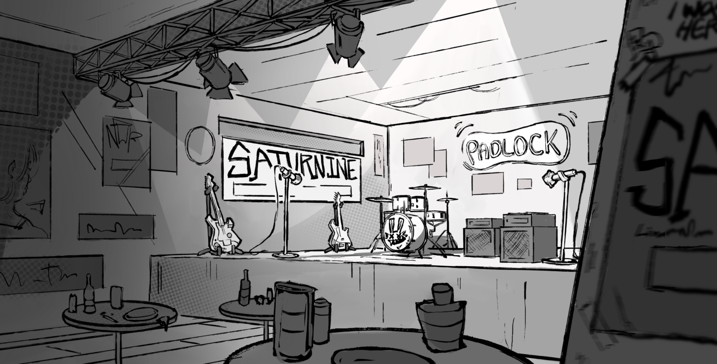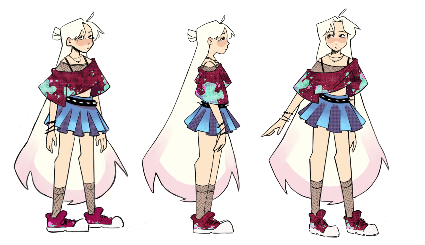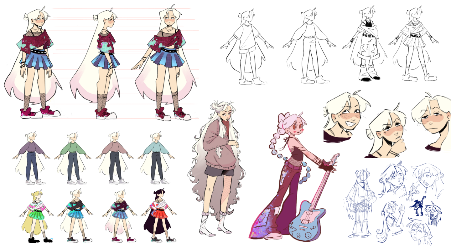 Visual development for a Character and Environments assignment called "Back Stage at Midnight" In a world where music turns into color, Mauve spent all her life ignoring music at the wish of her parents to focus on a steady future. But after going to a concert with her friend, she falls in love with music and pursues it in secret.