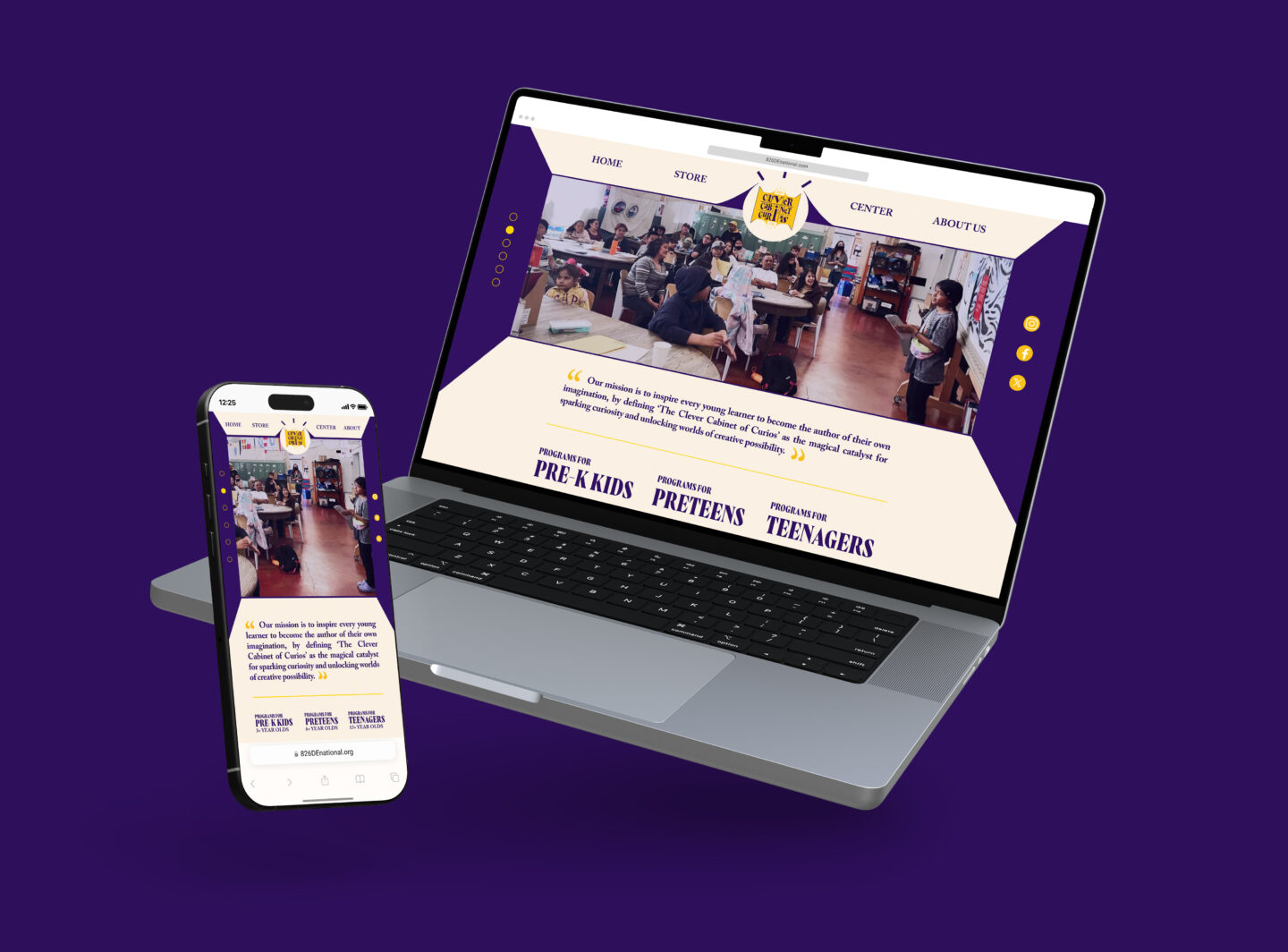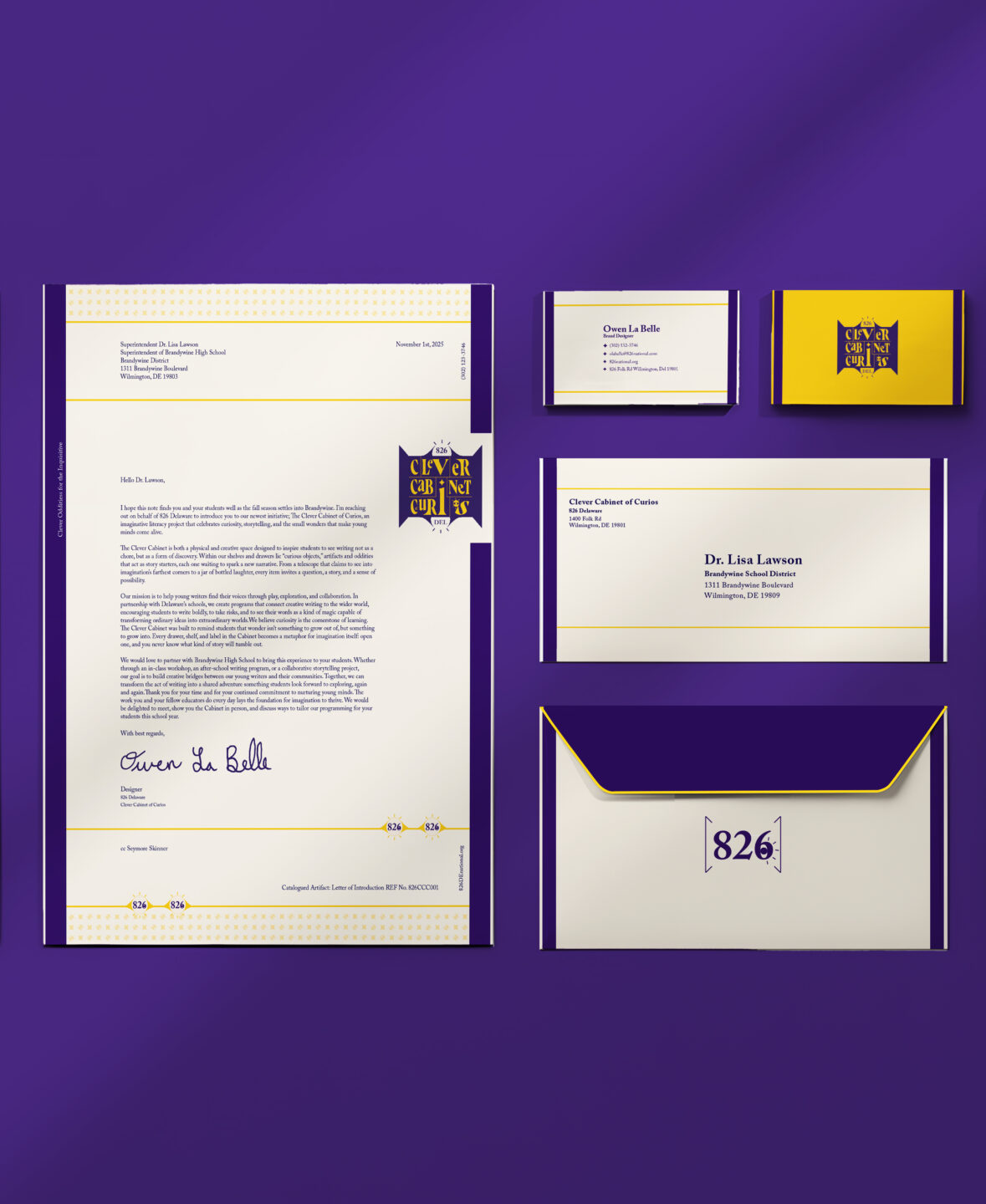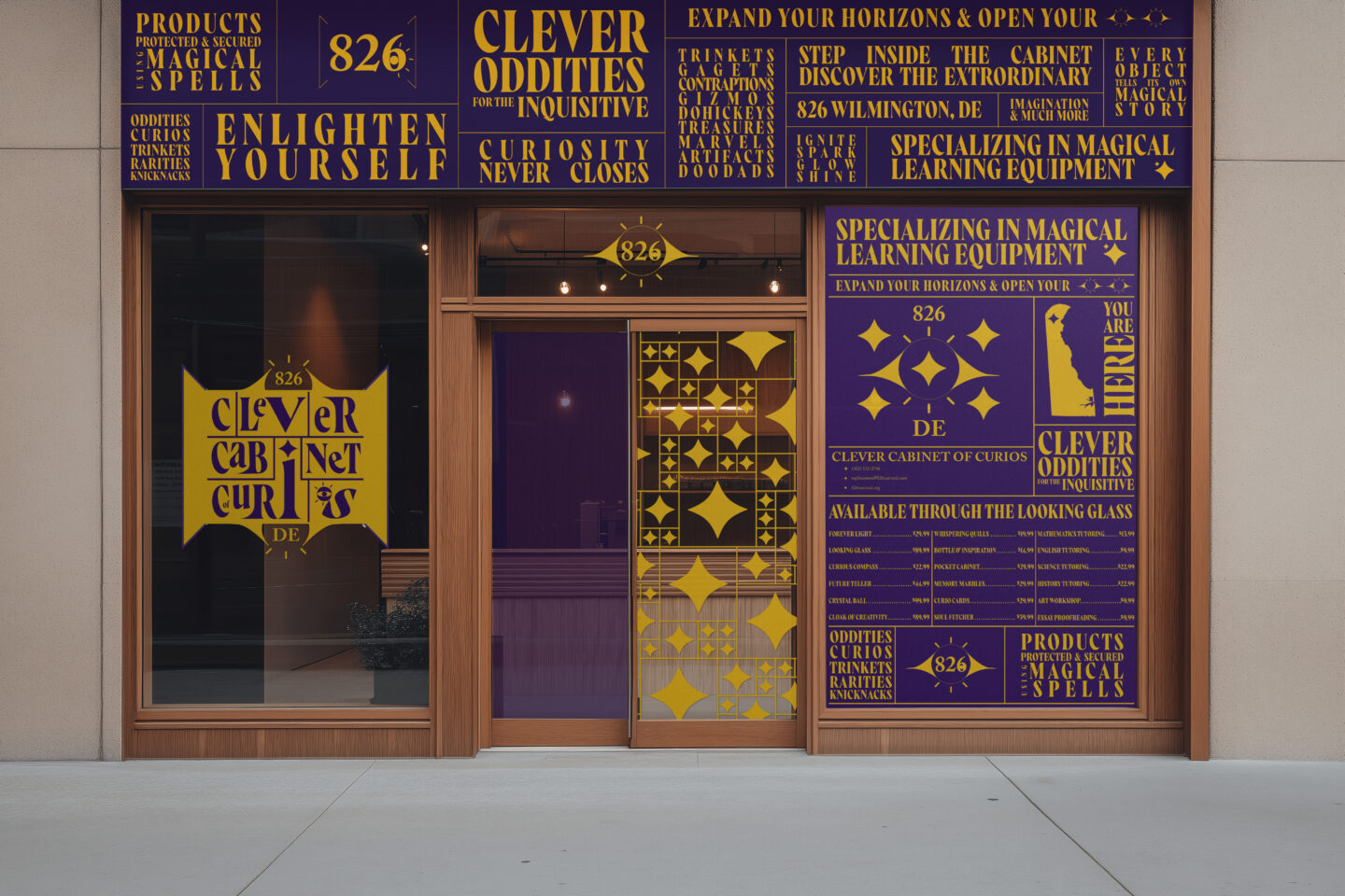 The Clever Cabinet of Curios is an 826 literacy center in Delaware, themed as a magical literacy brand built on curiosity, storytelling, and wonder. I created a full identity system: logos, patterns, merchandise, motion, storefront, and digital touch points, all designed to feel like a living oddities shop that empowers young writers to explore, question, and imagine. The result is an immersive, cohesive world where creativity leads and every detail invites discovery