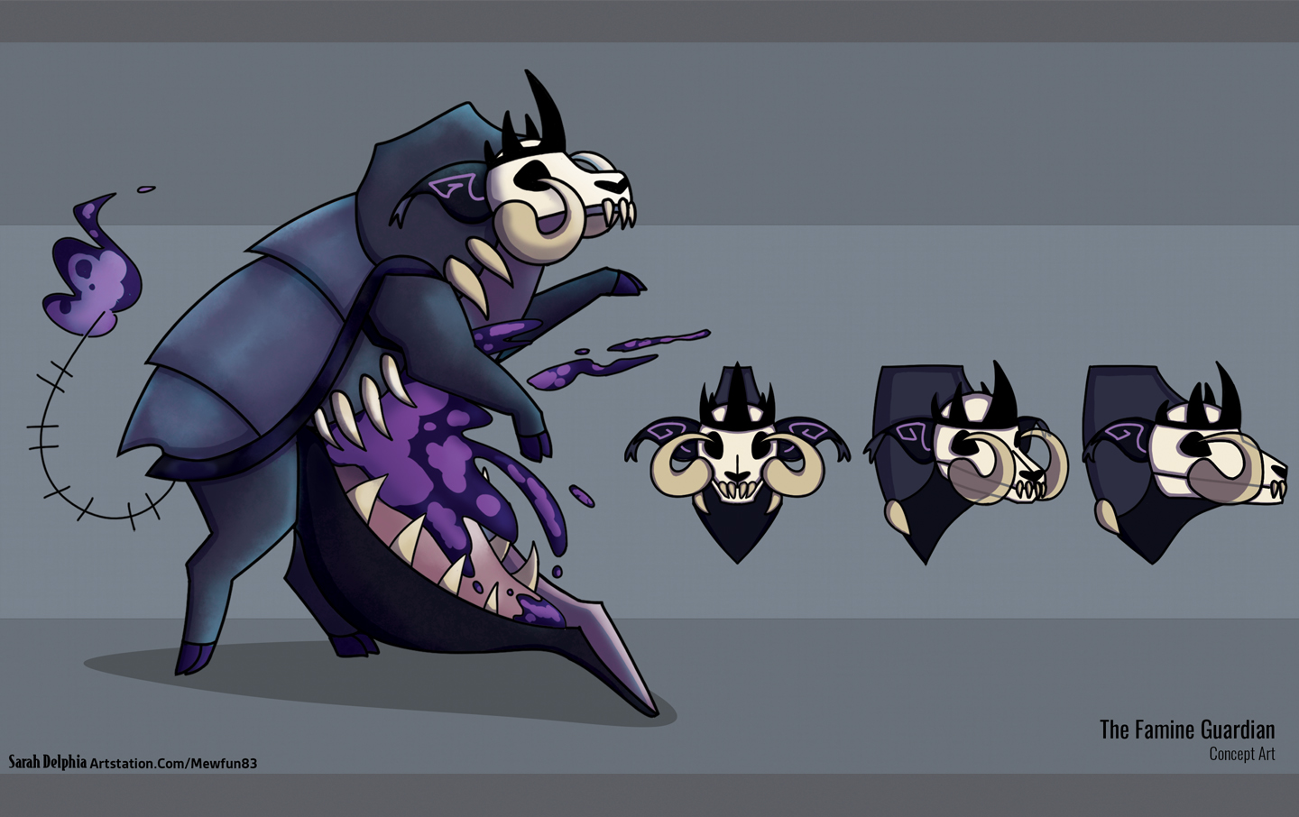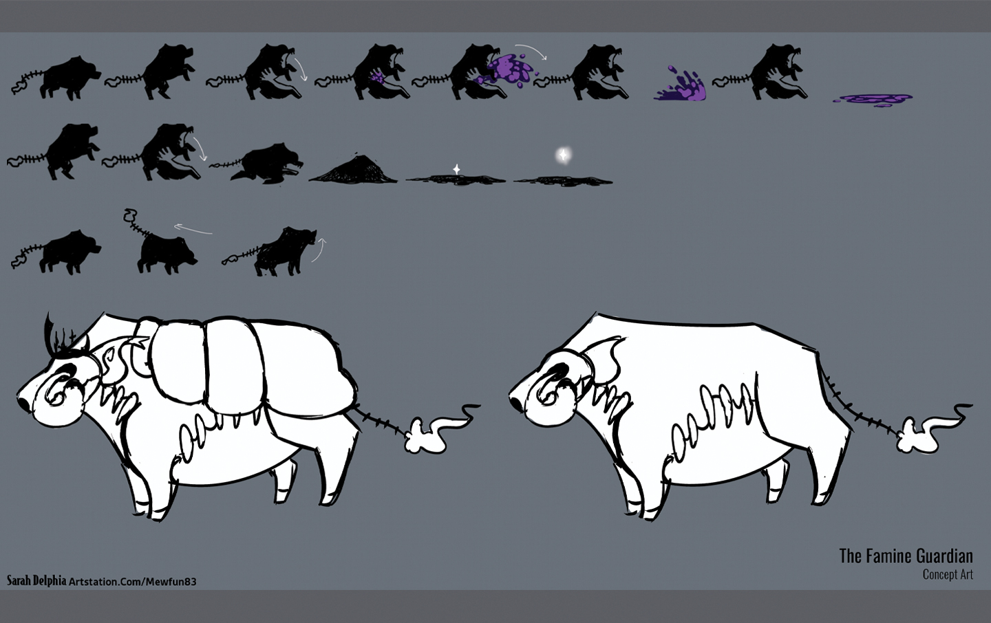 A collection of various ideation and polished images for the first main boss of Lumi-Dungeon named Famine.