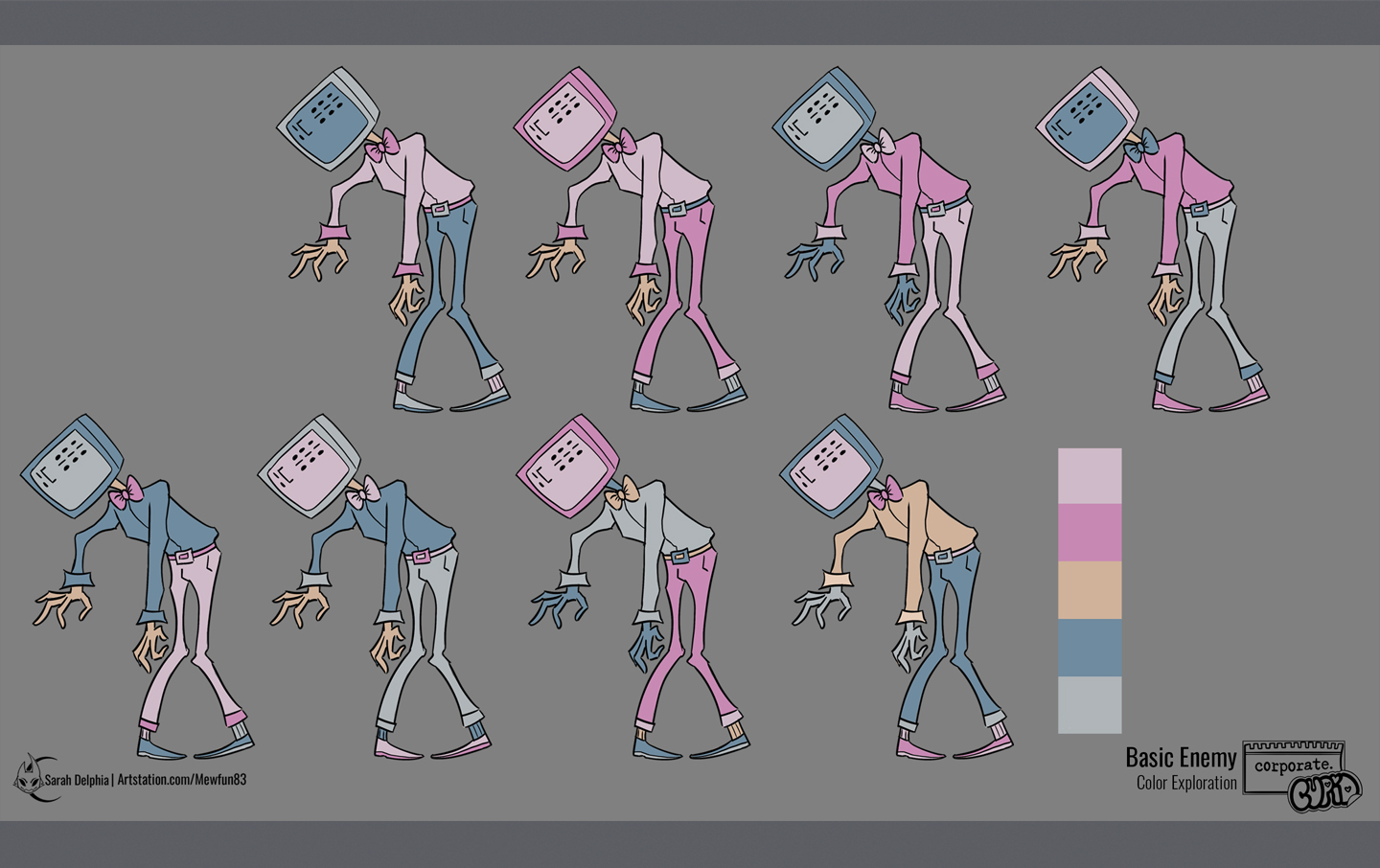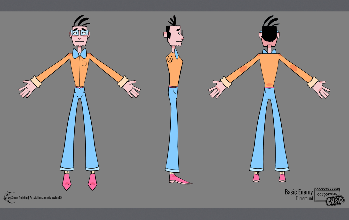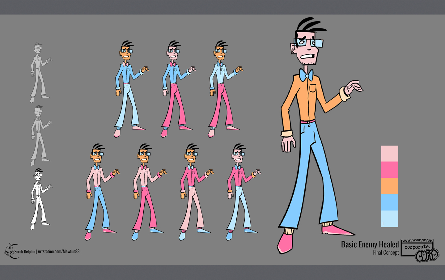 A collection of images of how I created the computer guy enemy for Corporate Cupid!