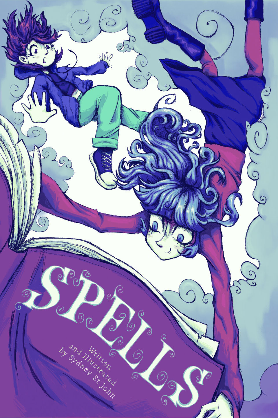 A collection of Sydney's comics and storytelling illustrations, including her original story Spells, along with its book cover.