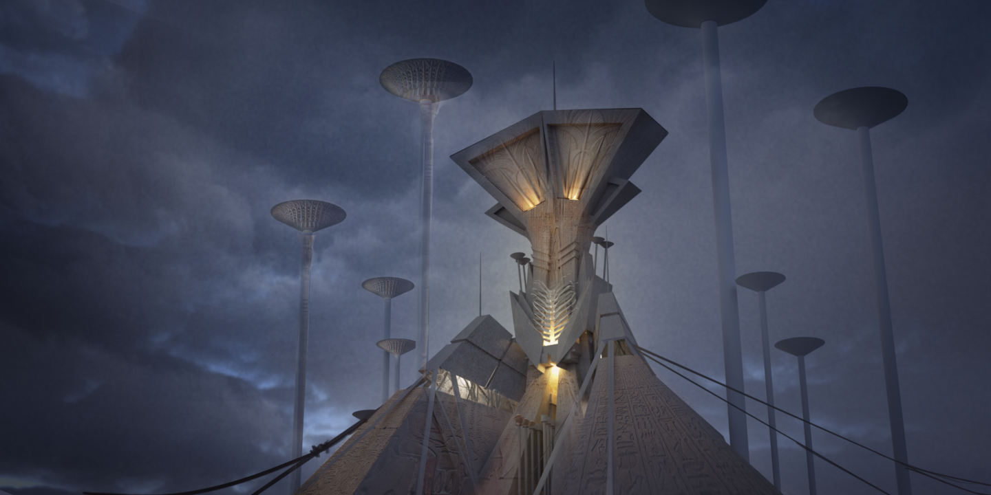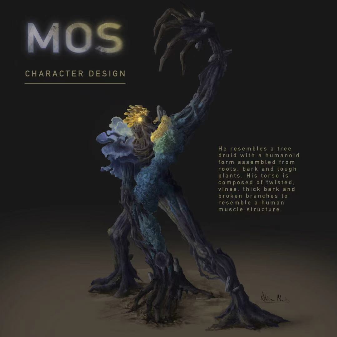 Media: Digital Software used: Blender, Photoshop On a distant alien planet, a perpetually humid and sweltering climate, along with abundant water and vast, deep cave systems, gave rise to an exceptionally advanced plant civilization. Beneath the surface, their roots and rhizomes constantly intertwine and coil around one another, extending outward like ribs and a spine. Together, they form a vast information network that connects half the hemisphere, continuously exchanging data, nutrients, memories, and thoughts, undergoing rapid and intense cycles of evolution. Such a remarkable planet soon attracted human explorers eager to uncover its secrets. They designed helmets and protective suits inspired by the shapes and structures of the native plants, allowing them to survive in the planet’s dense, humid environment. Equipped with advanced technology and scientific ambition, they descended into the deepest caves to conduct their investigations.